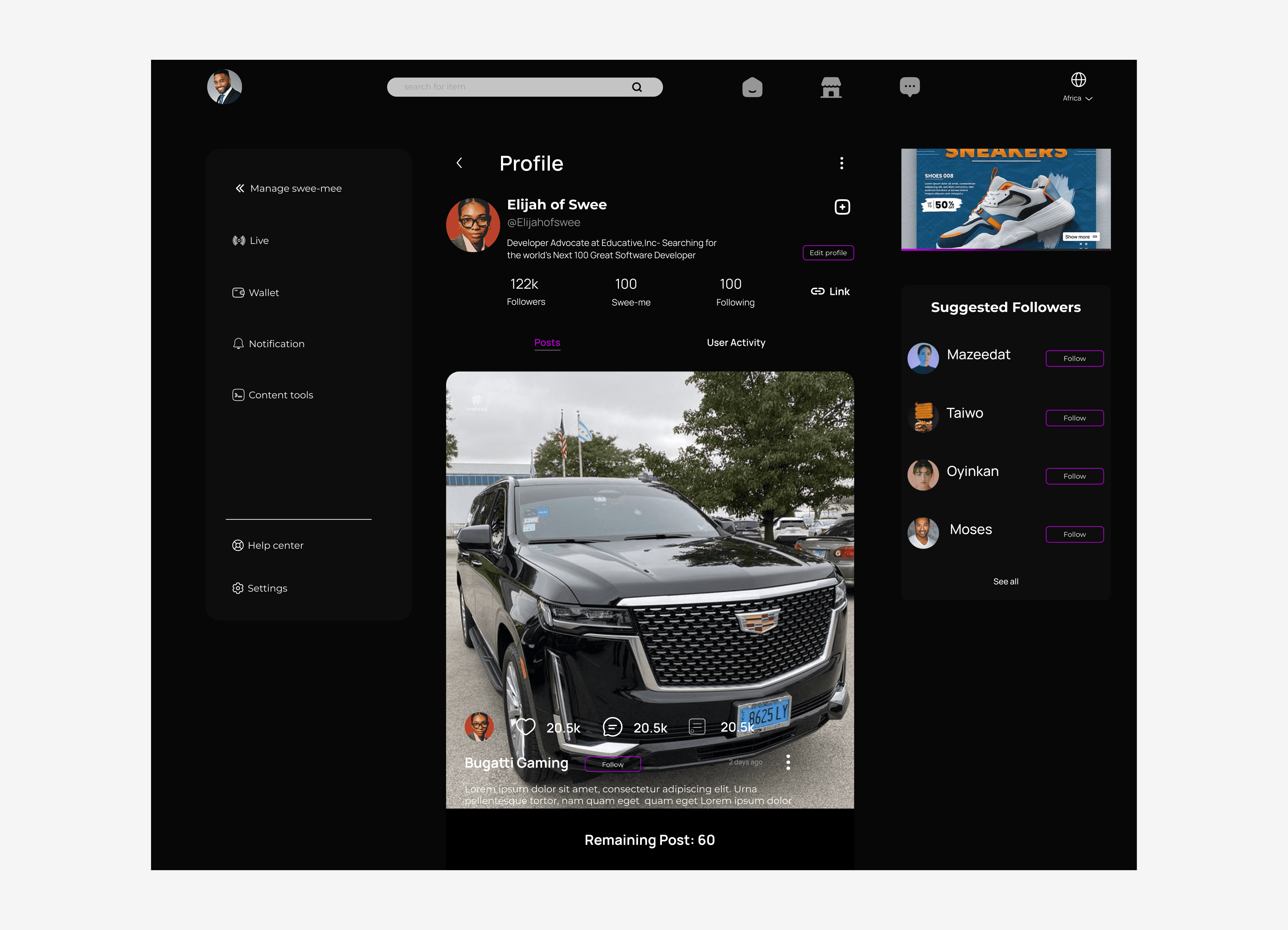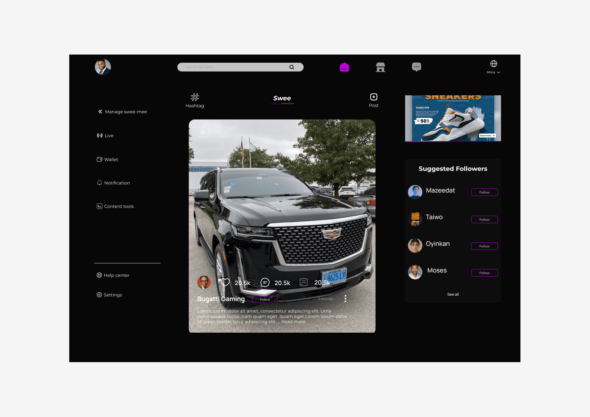 The social media App, Swee is a social media integrated with e-commerce and fintech tools it is a web and mobile app designed to make content more easy to create for content creators and also journalist...